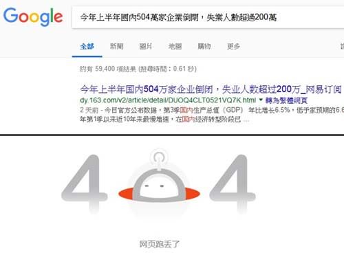 新唐人记者在谷歌搜索到了网易相关报导的标题,但点击链接显示〝404错误〞,说明报导或已因为〝犯政治错误〞被删除。