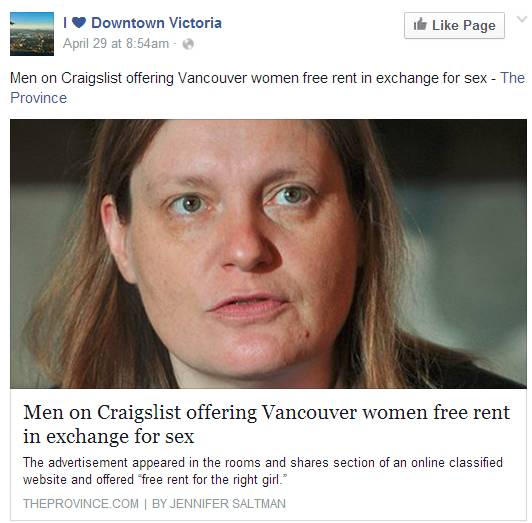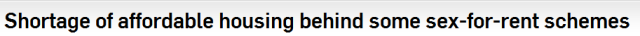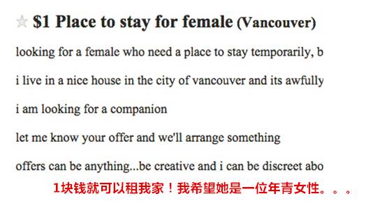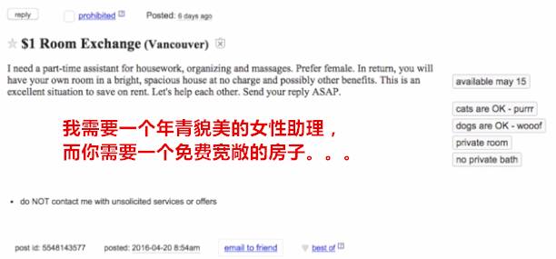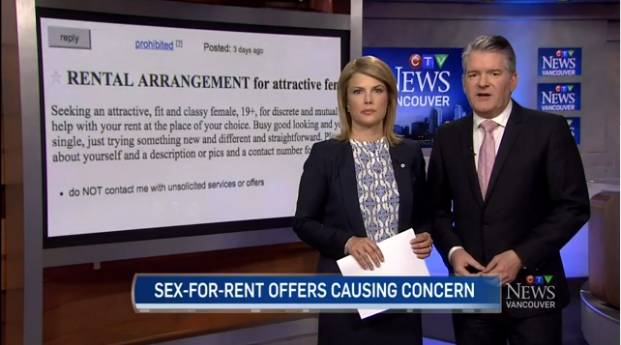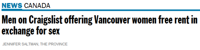 在温哥华,现在不少男人在网上刊登广告声称有房出租,租客对象仅限年轻女子,她们作为租客不用每月缴交租金,而是以性服务来代租。
