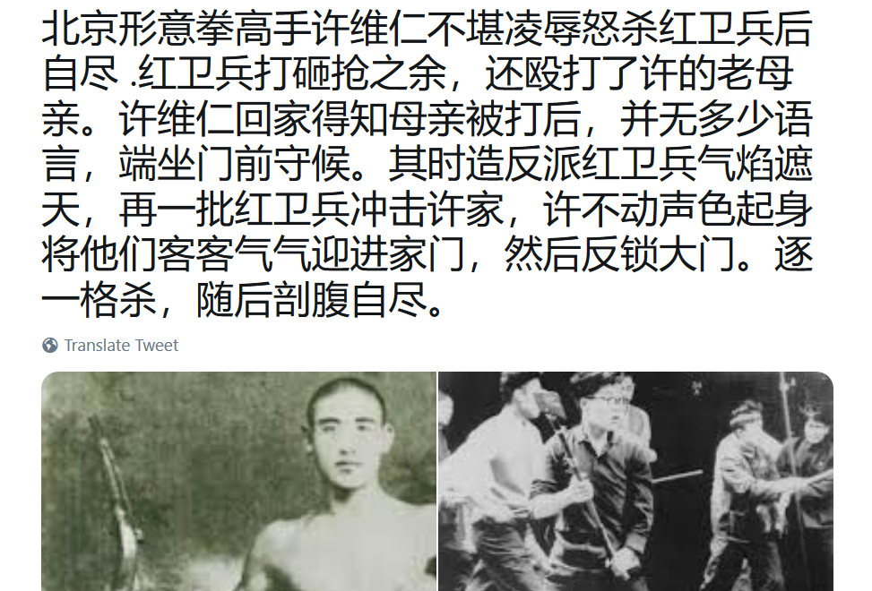 北京形意拳高手许维仁不堪凌辱怒杀红卫兵后自尽 国家 新闻 26 10 月, 2018 史海回顾 北京形意拳高手许维仁不堪凌辱怒杀红卫兵后自尽 .红卫兵打砸抢之余,还殴打了许的老母亲。许维仁回家得知母亲被打后,并无多少语言,端坐门前守候。其时造反派红卫兵气焰遮天,再一批红卫兵冲击许家,许不动声色起身将他们客客气气迎进家门,然后反锁大门。逐一格杀,随后剖腹自尽。 本文内容除特别注明外均取自各新闻媒体(本站底部列表)和youtuber twitter(x),chatgpt, gemini, 并不代表本站立场! 评论不允许人身攻击。 Posted in 史海回顾Tagged 许维仁