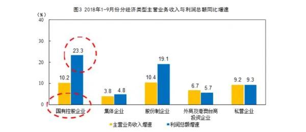 不同经济类型的企业2018年1-9月主营收入和利润总额同比增速,其中国有企业增值23.3%,数据来源:国家统计局报告