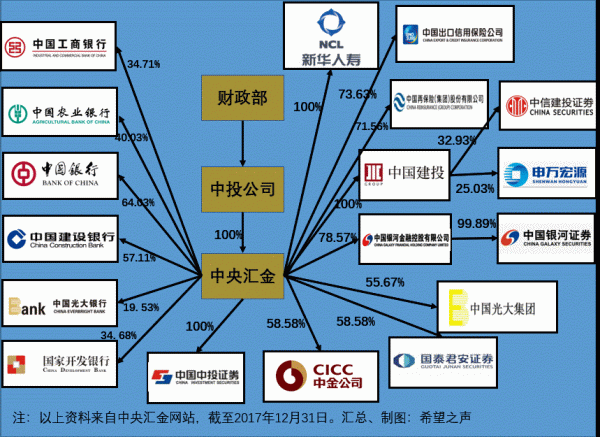 汇金公司投资架构图,它管理的资产超过4.35万亿元。数据来源,中央汇金网站,希望之声制图