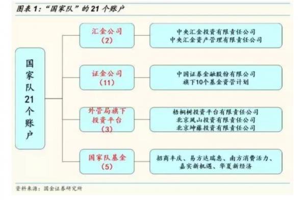 2017112日《中国基金》报道,国金证券分析师汇总得出,截至当年第三季度,‘国家队’包括汇金公司、证金公司、外管局旗下3个投资平台以及5支‘国家队’基金,共有21个账户。合计持股市值达4.43万亿,占A股总市值7.23%其中汇金汇金公司持有994家公司,持股市值达3.49万亿,占A股总市值比重为5.69%。在它们面前,任何私有或公募集基金和个人,都是小蚂蚁。