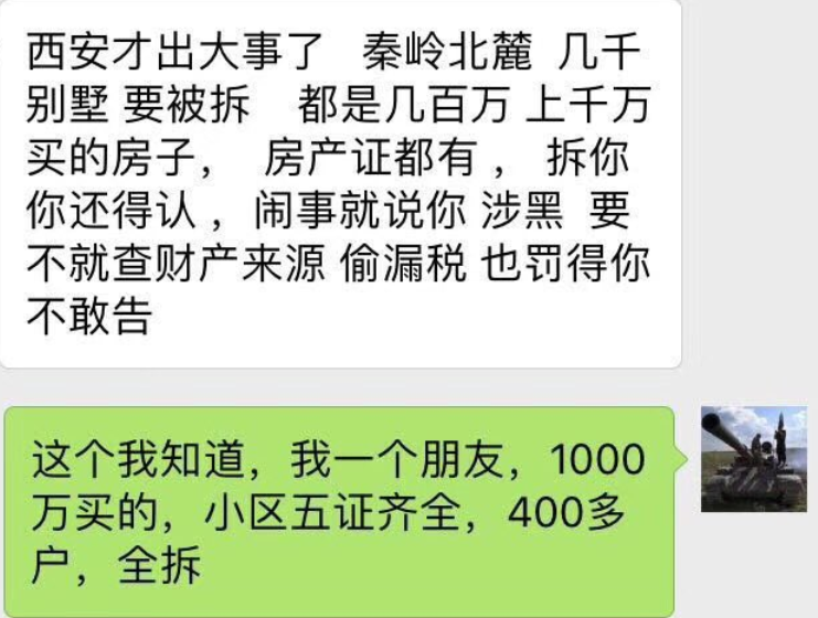 释道果: 西安要出大事了,在秦岭北麓有四百多户别墅的小区,业主们都是五证齐全,几干万的别墅说拆就拆,有房产证又能怎么样,强拆你还得认,敢闹事就说你涉黑,要不就查财产来源,找个偷漏税的借口也罚得你吃不了兜着走。