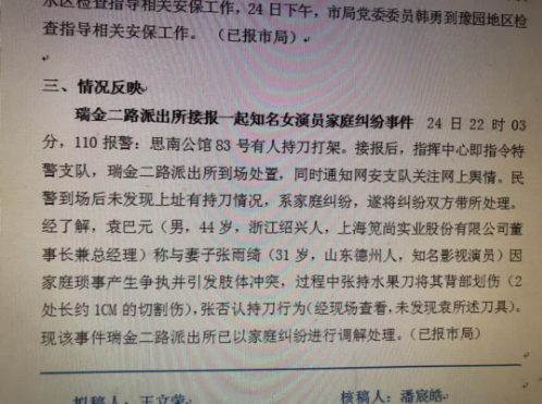 据截图文字描述,此案涉事双方正是知名女演员张雨绮及其丈夫袁巴元。二人因家庭琐事产生争执并发展成了肢体冲突。但对于袁巴元指控张雨绮持刀伤人说法,张予以否认,而民警也确实未发现刀具。目前该安件正在进行调解中,并已上报市局。