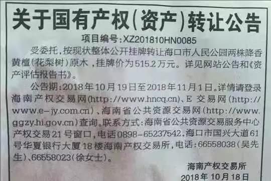 这次拍卖的两棵黄花梨树原本一直在公园里自然生长,到了2014年的,超强台风“威马逊”横扫海口市,带来严重破坏,海口市人民公园内的这两棵黄花梨树也没能幸免,在台风中受损之后,从2015年开始,这两棵树就开始出现了树皮开裂、叶子发黄脱落的情况。