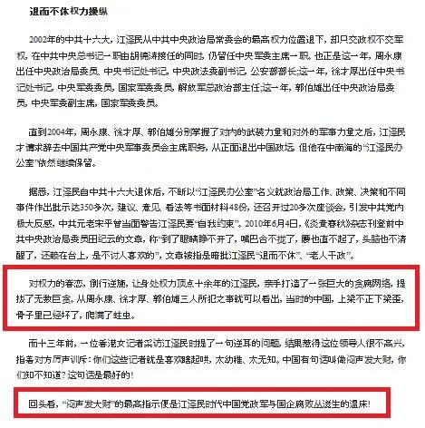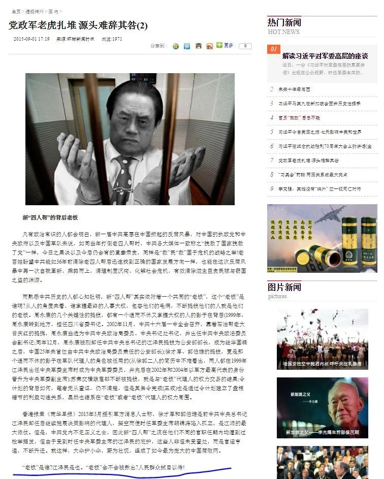 2015年9月1日,有军方背景的《环球新闻时讯》杂志网站,题为“党政军老虎扎堆源头难辞其咎”的文章说,“新四人帮”其实依附着一个共同的“老板”就是江泽民,并称群众拭目以待,揪出“老板”。