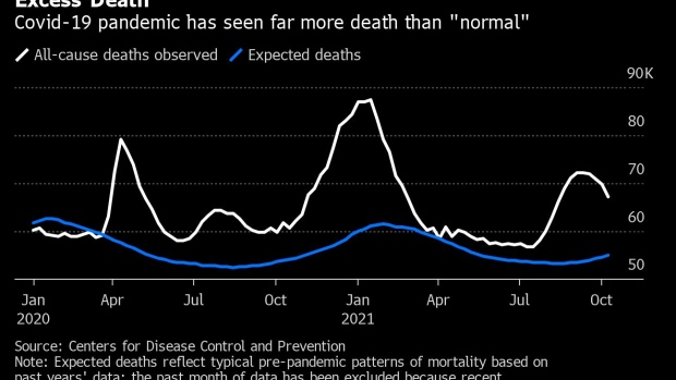 今年早些时候,美国的疫苗接种运动曾在大约4月至7月中旬期间帮助将所有原因导致的总死亡率恢复到接近“正常”水平。但德尔塔变种至少暂时破坏了这一改善,2021年夏季产生的额外死亡率甚至比去年同期还要高。