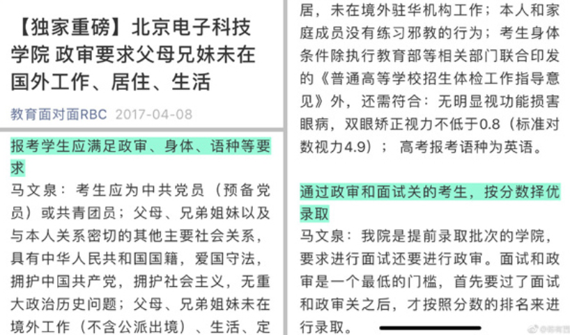 政审审什么?无海外关系! 国家 新闻 11 11 月, 2018 大陆资讯 1 Comment 有人以为政审只是审学生本人的政治思想表现和有无行为劣迹。错了。不论文字上口头上如何表述,政审实质上审父母历史和社会关系。父母上访,宗教信仰,赌博,嫖娼,判刑,移居,都会影响孩子入学。如果不信,看看北京电子科技学院的招生政审说明。 本文内容除特别注明外均取自各新闻媒体(本站底部列表)和youtuber twitter(x),chatgpt, gemini, 并不代表本站立场! 评论不允许人身攻击。 Posted in 大陆资讯, 荒唐世界Tagged 海外关系 Related Posts 登记海外关系,追查海归间谍;中国开始排查华侨、留学生情况 习近平歇斯底里反击:解放军有海外关系一律是间谍!
