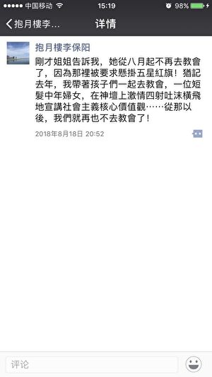 “姐姐告诉我,她从八月起不再去教会了,因为那里被要求悬挂五星红旗……”中山大学博士、留校研究员李保阳就因为在微信上发表了这些言论,被中山大学除名,定性为“反党”,并被不明身份人员绑架,最后被迫逃离中国大陆。