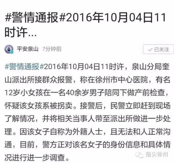 当天,泉山公安分局对此发布了一则警情通报,通报称,4日11时许,奎山派出所接群众报警,称在市中心医院有名12岁小女孩在一名40余岁男子的陪同下做产前检查,怀疑女孩系被拐卖。“接警后,民警立即赶到现场了解情况,并将相关当事人带至派出所做进一步处理。因该女子自称为外籍人士,且无法和人正常沟通,目前,警方正对该名女子的身份信息和具体情况进行进一步调查。”