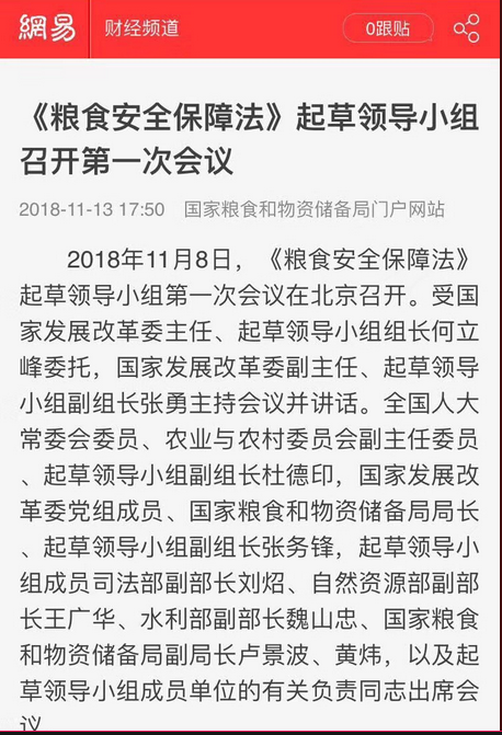 《粮食安全保障法》开始起草了,统购统销,按计划供给粮食还会远吗?我们2017年27%口粮需要进口补充,还没有统计从边境流入数据。 春节开始粮食涨价、号召减少在外就餐、粮食供给凭证制正在计划!吃草还是吃粮,马上见分晓!