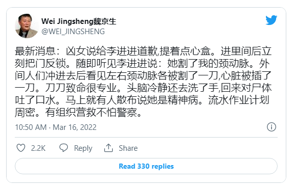 3月15日,魏京生在推特发文:“最新消息:凶女说给李进进道歉,提着点心盒。进里间后立刻把门反锁。随即听见李进进说:她割了我的颈动脉。