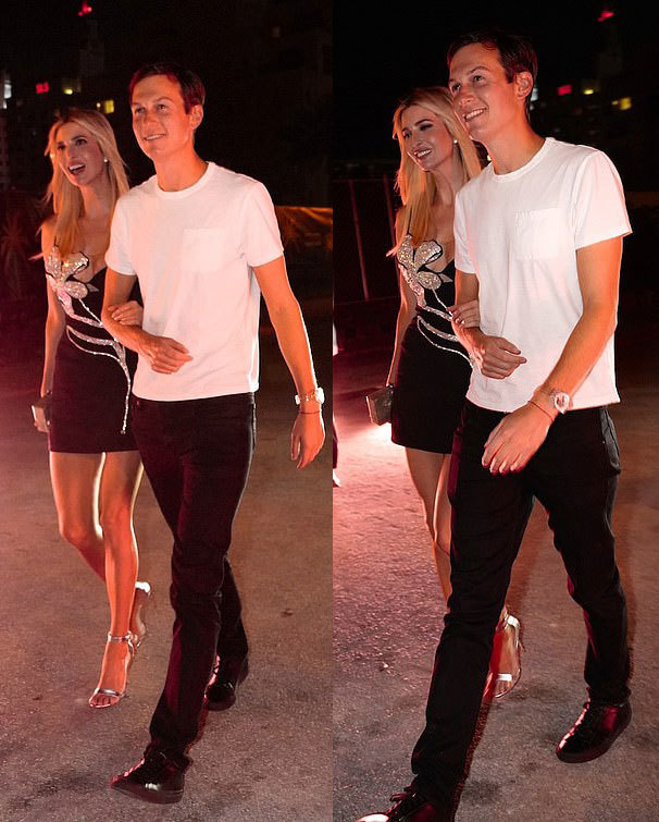 当地时间5月5日晚,伊万卡出现在佛罗里达州迈阿密的一家豪华海滨餐厅外,挽着丈夫贾里德·库什纳的手臂,准备享受她的约会之夜,金发在灯光的照耀下更添魅力。