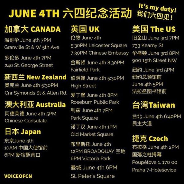 本周六(6月4日)是1989年六四血腥镇压33周年,虽然在香港纪念六四已被禁止,但全球各地纷纷举办悼念活动。