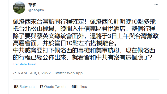 佩洛西来台湾访问行程确定,3日上午与蔡英文会面 中国记忆 1 8 月, 2022 美中超限战 佩洛西来台湾访问行程确定!佩洛西预计明晚10点多飞抵台北松山机场,晚间入住信义区君悦酒店。整个行程除了要与蔡英文总统会面外,还将于3日上午与台湾党政高层会面,并于当日10点左右搭机离台。 中共威胁要打下佩洛西的专机和美军航母,现在佩洛西的行程已经公布出来,就看习和中共有没有这个胆了? 本文内容除特别注明外均取自各新闻媒体(本站底部列表)和youtuber twitter(x),chatgpt, gemini, 并不代表本站立场! 评论不允许人身攻击。 Posted in 美中超限战Tagged 佩洛西, 台湾, 蔡英文, 行程Related Posts 打台湾就抓习近平,美国完全有这个能力! 中共大内斗,深夜军演恐吓台湾 《旧金山和约》决定台湾地位未定,是国际条约而不是宣言 马英九呛高市早苗!王兴焕:把盟友当敌人 视中国为家人 许多台湾网友笑翻:第一次这么支持中共! 中共政军不合,美国重新定位台湾!美台即将建交 接触五眼联盟最高机密,他透露习近平大消息 美国可能和台湾建交,但川普会要求台湾为他们的安全买单 国台办说“心疼台湾孩子” ;网民用于朦胧案臭骂发言人朱凤莲八辈祖宗 李克强亲笔信致信台湾人民曝光:习近平道德败坏不懂人间疾苦 美国斩首打法令习近平胆颤心惊!不敢再谈打台湾;哈梅内伊已交代后事 拜登誓言保卫台湾,赖清德把决定战争的权力给与前线士兵