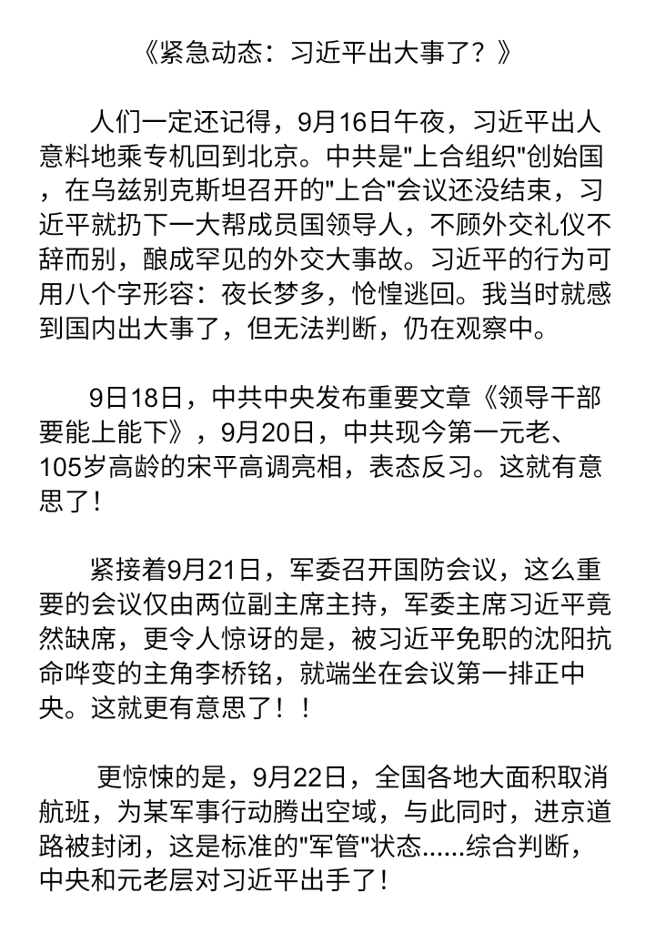北京惊传:14日习出访中亚,当天下午胡温成功说服前任常委宋平,并在当天晚上控制了中 央 警 卫 局。单线通知了江曾和在京中 央 委 员,原来的常委们,以举手表决行式,罢黜了他的军权,当他知道后,16日晚返京,在机场被控制,现软禁在中 南 海 家中,十九届七 中全会将宣布真像。