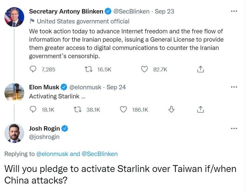 华邮专栏作家罗金(Josh Rogin)在推特PO文,向马斯克及美国国务卿布林肯提问,“倘若中国犯台,你会启动星链助台吗?”(图取自Josh Rogin 推特)