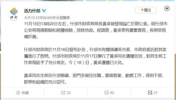 中国四川省什邡市财政局局长黄卓在15日下午自缢身亡,针对寻死原因,中共官方给的答案是「长期受严重胃病折磨」。(图撷取自微博)