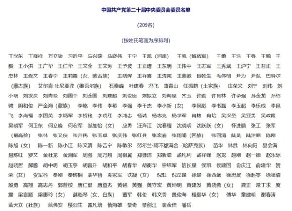 闭幕会结束后,当天下午,中共党媒新华社率先公布了205人的中委名单。