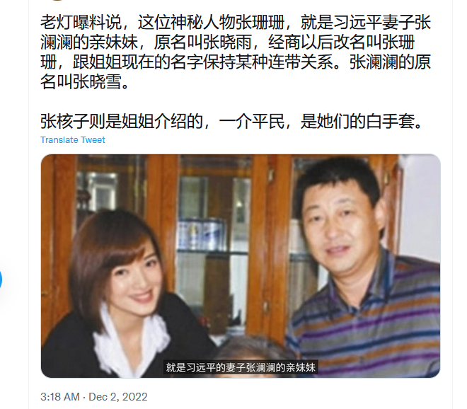 老灯曝料说,这位神秘人物张珊珊,就是习远平妻子张澜…