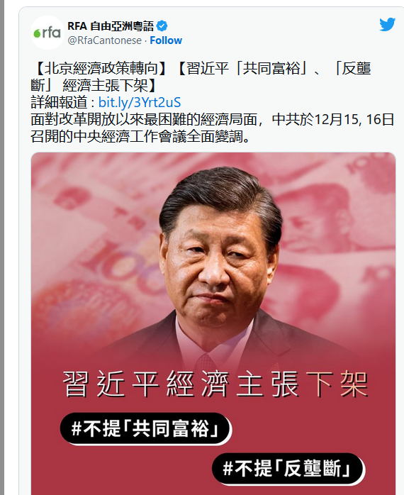 过去几年习近平提出的口号,包括反对资本无序扩张、反垄断、共同富裕等压制民营经济生存空间的政策,甚至连「动态清零」等,这次会议都只字不提。