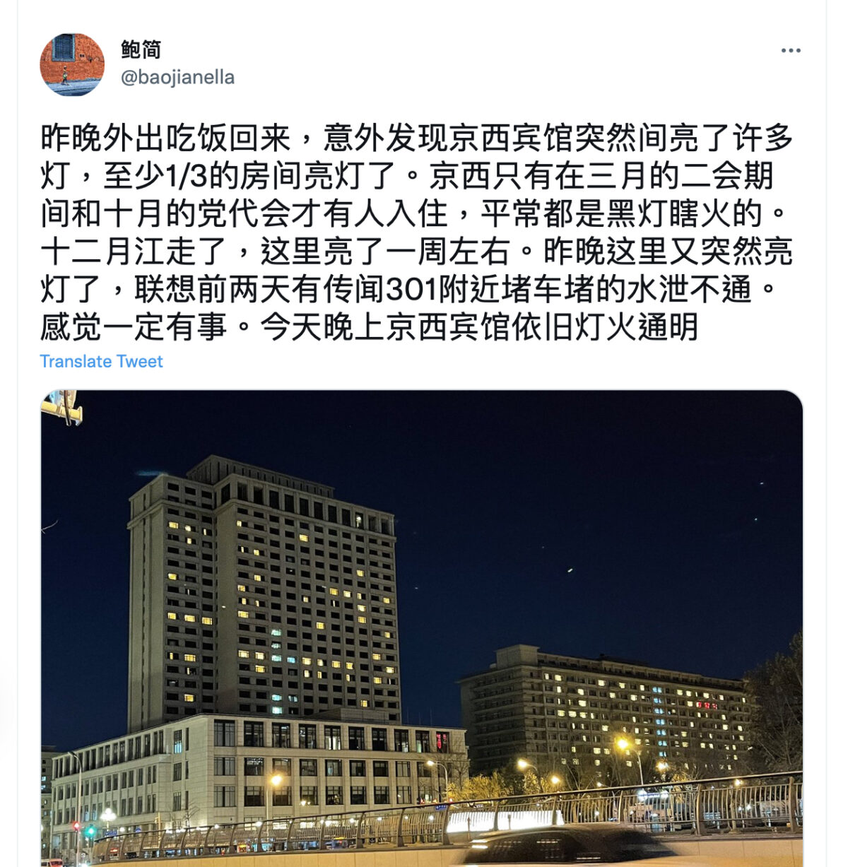 23日,鲍彤女儿鲍简在推特发推称,“昨晚外出吃饭回来,意外发现京西宾馆突然间亮了许多灯,至少1/3的房间亮灯了。京西只有在三月的二会期间和十月的党代会才有人入住,平常都是黑灯瞎火的。十二月江走了,这里亮了一周左右。昨晚这里又突然亮灯了,联想前两天有传闻301附近堵车堵的水泄不通。感觉一定有事。今天晚上京西宾馆依旧灯火通明。”