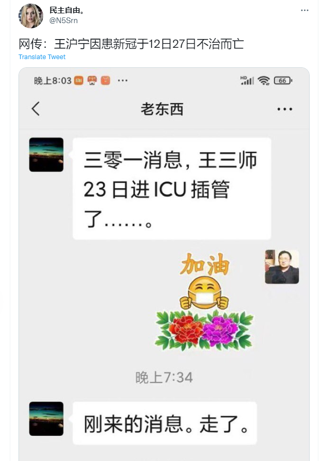 网传:王沪宁因患新冠于12日27日不治而亡