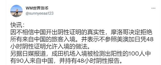 中共提供虚假核酸证明,成田机场阳性患者100%有核酸阴性证明 中国记忆 3 1 月, 2023 祸乱全球 因不相信中国开出阴性证明的真实性,摩洛哥决定拒绝所有来自中国的旅客入境。并表示不参照美澳加日凭48小时阴性证明允许入境的做法。 另据日媒报道,成田机场入境被检测出阳性的100人中有90人来自中国,并持有48小时阴性报告。 本文内容除特别注明外均取自各新闻媒体(本站底部列表)和youtuber twitter(x),chatgpt, gemini, 并不代表本站立场! 评论不允许人身攻击。 Posted in 祸乱全球Tagged 成田机场, 核酸证明, 核酸阴性证明