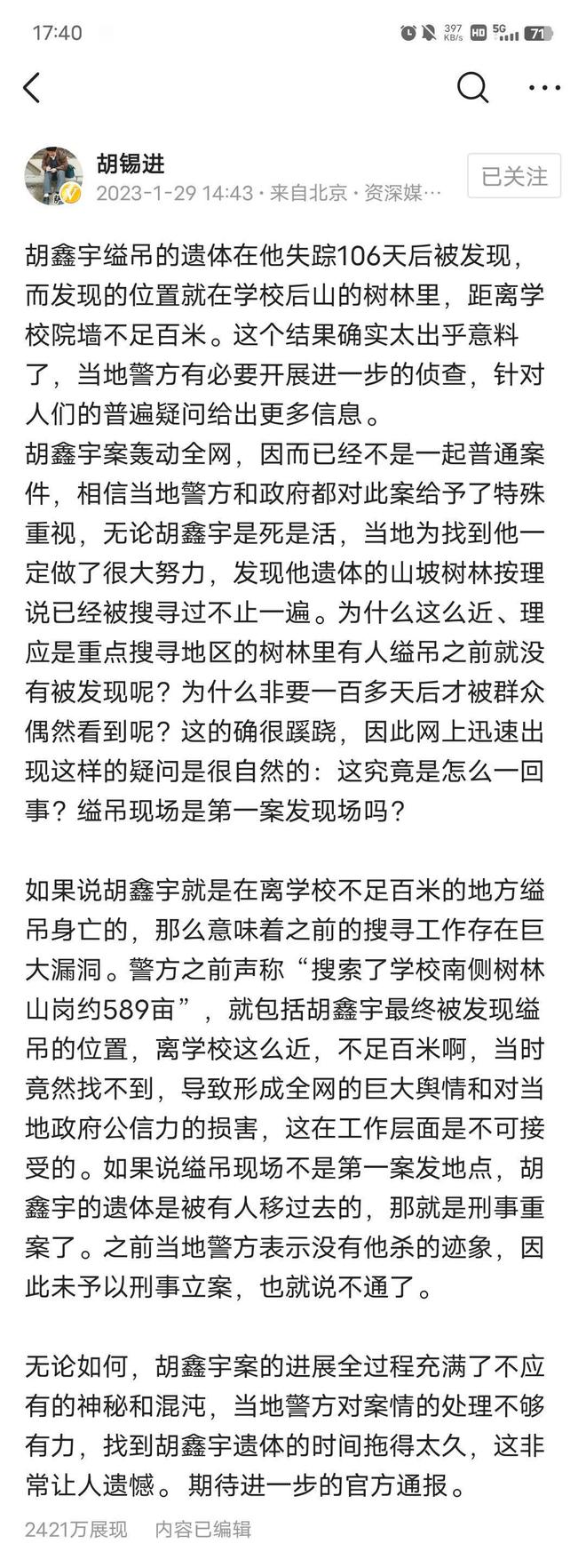 胡锡进:胡鑫宇案太神秘,若遗体是被人移过去就是刑事重案