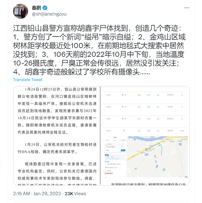 不光我们关注此事,前环球时报总编辑胡锡进都认为胡鑫宇吊缢案发现场很蹊跷,老胡质疑为什么这么近、理应是重点搜寻地区的树林里有人缢吊之前就没有被发现呢?为什么非要一百多天后才被群众偶然看到呢?缢吊现场是第一案发现场吗?