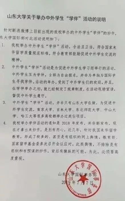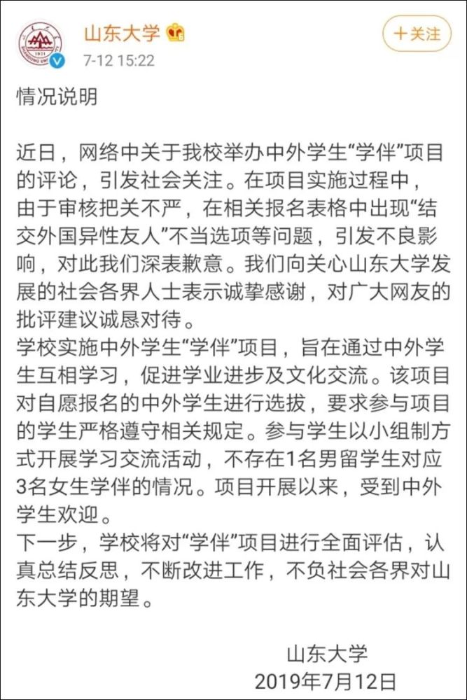 近日,网络中关于我校举办中外学生“学伴”项目的评论,引发社会关注。在项目实施过程中,由于审核把关不严,在相关报名表格中出现“结交外国异性友人”不当选项等问题,引发不良影响,对此我们深表歉意。我们向关心山东大学发展的社会各界人士表示诚挚感谢,对广大网友的批评建议诚恳对待。