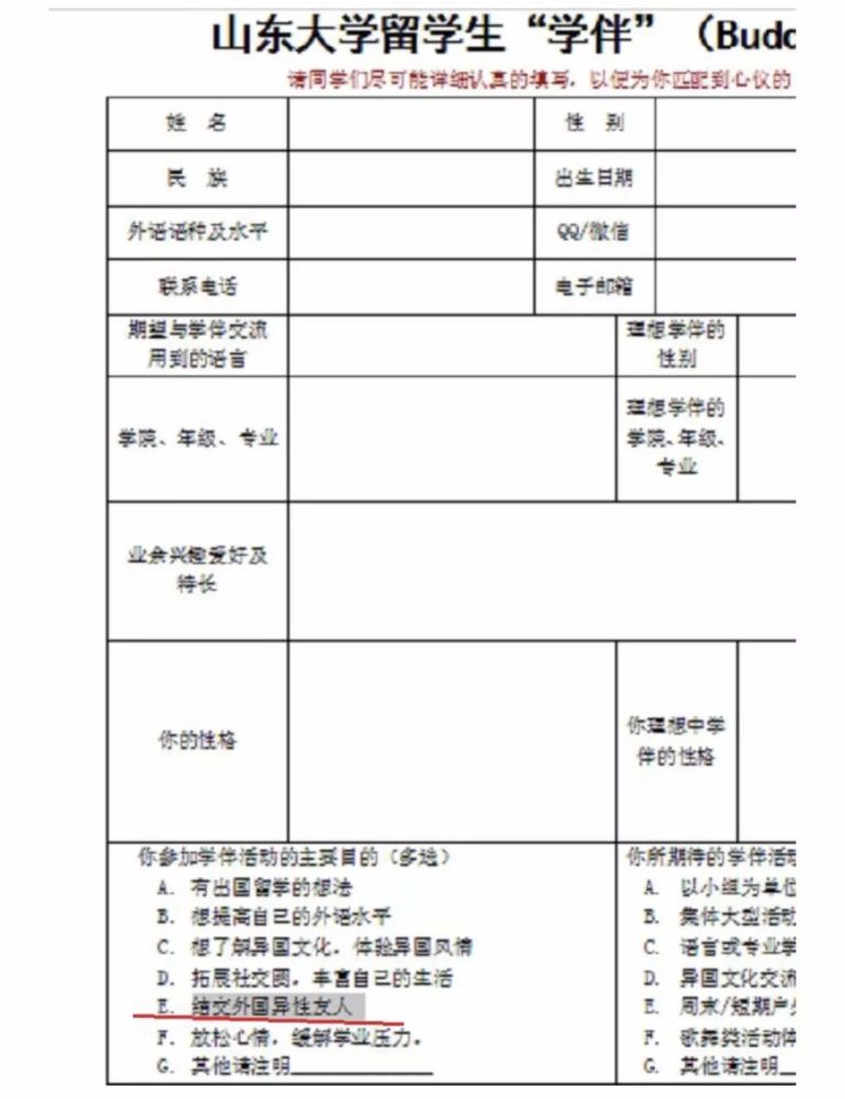 在报名表中还特别强调了学伴的性别,将“结交外国异性友人”列为选项之一。在表头用红字著名:“请…以便为你匹配心仪的学伴。”