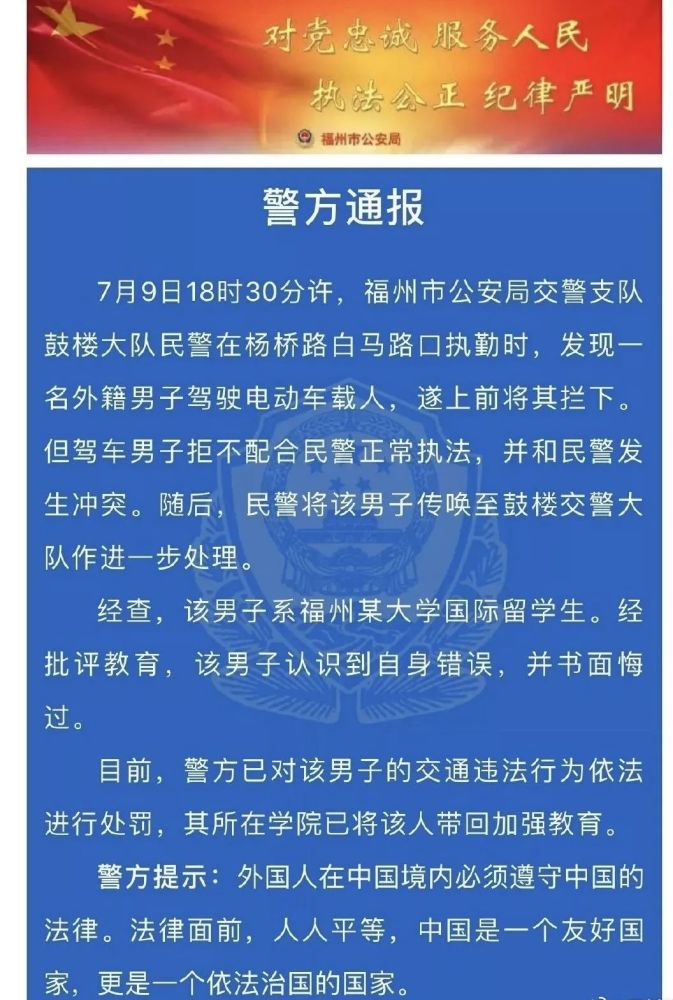 7月9日,福州,一名骑着电动车的外籍男子因违规载人,在路口被交警拦下,他竟5次推搡交警,暴力抗法。隔日,福州公安通报称:该男子是福州某大学国际留学生,警方已对其交通违法行为进行处罚,经批评教育后,其已被学院带回。