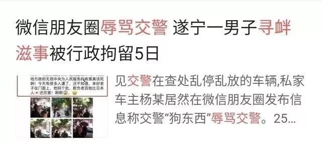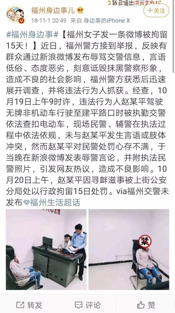 同样是发生在福州的事件,一女子因驾驶无牌非机动车被交警查扣,心存不满,在微博发表辱骂交警言论,被以寻衅滋事处以行政拘留15日。