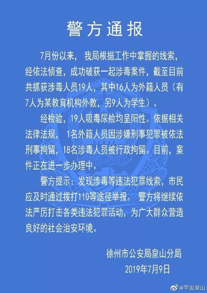 除其之外他们吸毒率非常高,近日江苏徐州就抓获涉毒人员19人,其中16人外籍,9名外教7名学生。