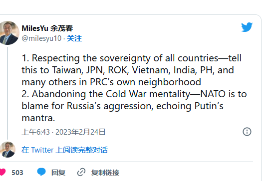前美国国务院办中国政策首席顾问余茂春在推特上犀利点评北京的12点和平计划。