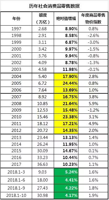 消费快速增长的年份,乃是2004-2012年,此后的消费增速就剧烈下降。2017的消费增速下降到10.23%,今年1-10月已经下降到4.17%,乃是1998年以来的最低值。消费不振,应该是板上钉钉的事了。消费不振的原因在于居民借钱买房买到了极限,棺材本的8成都拿去买了房。麻烦在于,今年以来的物价开始呈现压制不住的趋势,1-10月份的消费物价累计涨幅达到了1.9%。眼看着消费增速持续下降,物价涨幅持续上升,如果两者实现成功会师,那就是经典的“滞涨”。