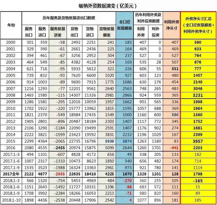 截至10月底,集合服务贸易、货物贸易和投资三方面数据,整合出来的结果,我国今年净吸纳外资185亿美元,乐观预计,即便是今年最后的两个月货物贸易不萎缩,各路抢出口的企业一直抢到今年年底去,美国西海岸密密麻麻的运输船一直排队排到年底,全年也就是200亿美元左右了。相对于2017年的1798亿美元来说,这200亿美元也就是个小指头那么一丁点,几乎不知道应该怎么评价。