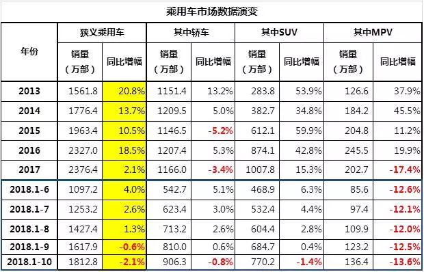 注意看,上表中的狭义乘用车销量增幅数据,2017年已经不好看了,只有2.1%,其中轿车和MPV销量都出现了萎缩,好在SUV的销量还行,撑起了整个市场。但是到了2018年,连SUV的销售都撑不住了,于是到了10月底,整个乘用车销量整体萎缩2.1%,轿车、SUV和MPV销量齐齐萎缩。对于国内那些还在计划扩大产能的汽车企业来说,这实在是一件非常可怕的事。
