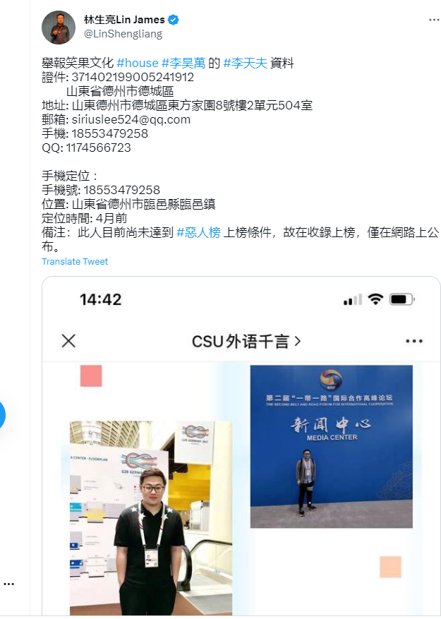 举报笑果的李天夫遭到人肉,现在讨饶 中国记忆 18 5 月, 2023 文字狱 3 Comments 举报笑果的李天夫,还是赵立坚的校友。笑果已经被立案了。文革就这样! 举报笑果的李天夫,还是赵立坚的校友。笑果已经被立案了。文革就这样!举报笑果的李天夫,还是赵立坚的校友。笑果已经被立案了。文革就这样! 举报笑果的李天夫遭到人肉,现在讨饶 本文内容除特别注明外均取自各新闻媒体(本站底部列表)和youtuber twitter(x),chatgpt, gemini, 并不代表本站立场! 评论不允许人身攻击。 Posted in 文字狱Tagged 人肉, 李天夫, 笑果 Related Posts 饭店卖人肉!广西柳州饭店骨头吃出外科手术使用的钛钢钉 胡锡进遭官方驳斥,吓破胆半夜改微博; 同行之间赤裸裸的仇恨 《看不见的墙》在国内疯传,普通人的无奈被表达的淋漓尽致 龚虹嘉是海康威视的老总两个孩子在海外上学,网友发起人肉活动,誓言将他的孩子送回中国接受教育!