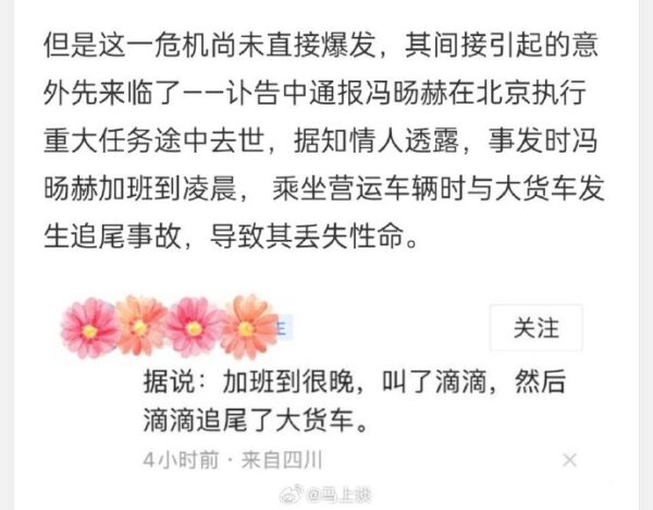 据搜狐网报导,知情人士透露,7月1日,冯旸赫为执行一项重要保密任务,一直加班到凌晨2点多,在坐滴滴车回家的过程中,由于滴滴车撞上货车发生了重大车祸,导致其当场死亡。