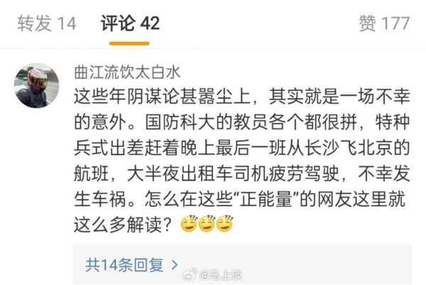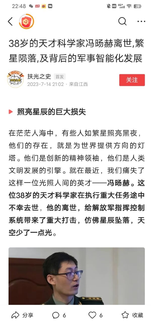 • 38岁中共军事专家冯旸赫车祸死亡;这厮曾在哈佛学得AI精髓后效命中共军队