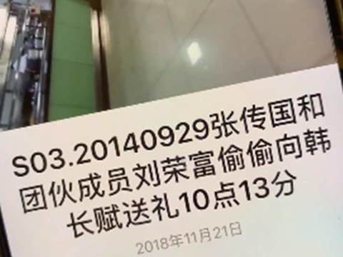 吃惊的原因是,视频中有一段手机上的文字显示:“S03.20140929张传国和团伙成员刘荣富偷偷向韩长赋送礼10点13分”,下面的时间显示是2018年11月21日。