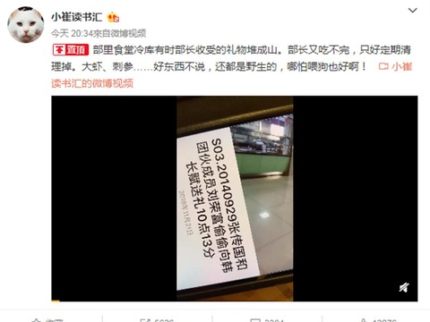 崔永元也发微博称,“部里食堂冷库有时部长收受的礼物堆成山。部长又吃不完,只好定期清理掉。大虾、刺参……好东西不说,还都是野生的,哪怕喂狗也好啊!”