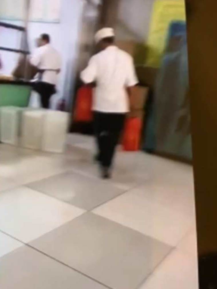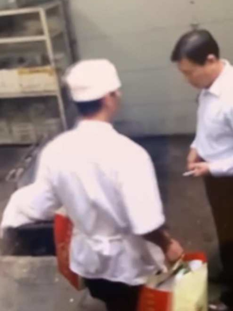 通过视频可知,有一个厨师模样的男子两手都拿着礼物,走向厨房,并通过厨房来到后院,疑似要将两盒礼物交给“领导”似的人物。