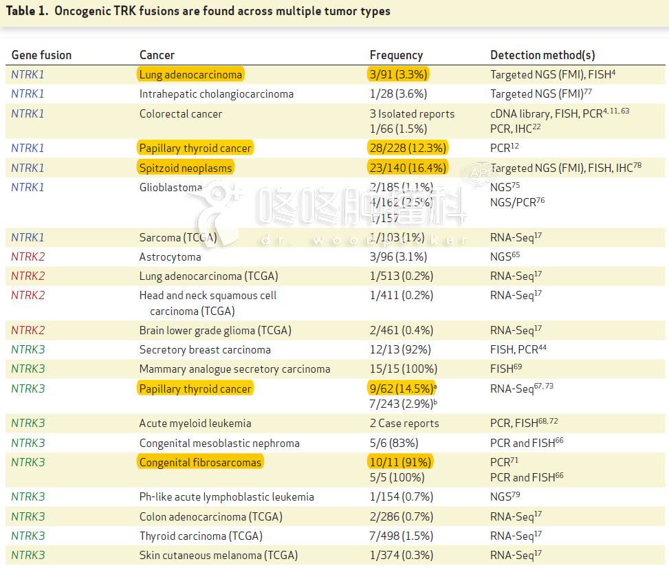 而对于国内常见的肺癌和肠癌,NTRK融合的比例比较低,分别在3.5%和1.5%。不过,对于做过多基因检测的患者(一般是同时检测几百个基因),一定去看看检测报告有没有这个NTRK基因融合。虽然概率低,万一碰上了,就真的中大奖了。