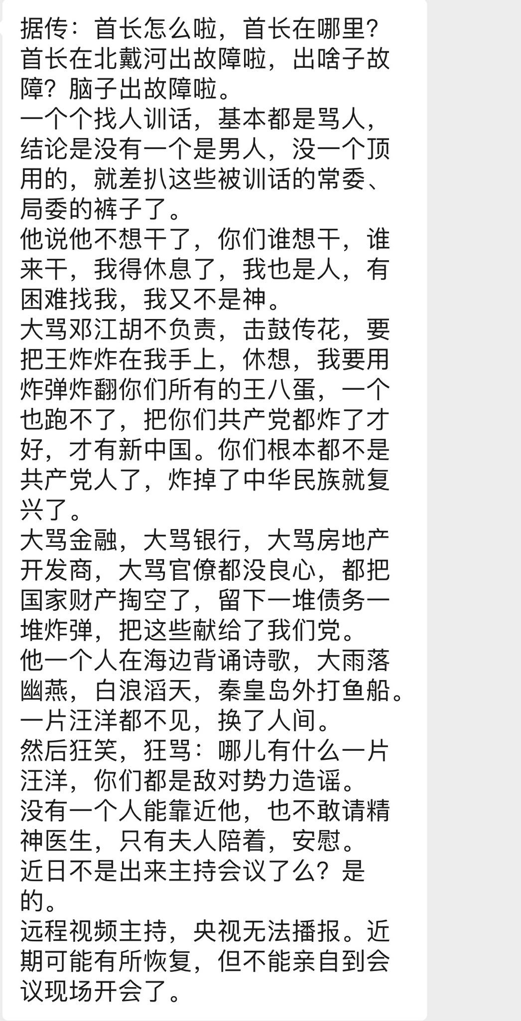 据推特网友弧度度的爆料,据传首长在北戴河出故障,一个个找人训话,基本都是骂人,结论是没一个顶用的。首长还诉苦“我也是人,有困难都好我,我又不是神。”据传,首长在北戴河大骂前任不负责,留下烂摊子,大骂银行、房地产开发商,官僚将国家掏空,留下一推债务炸弹。
