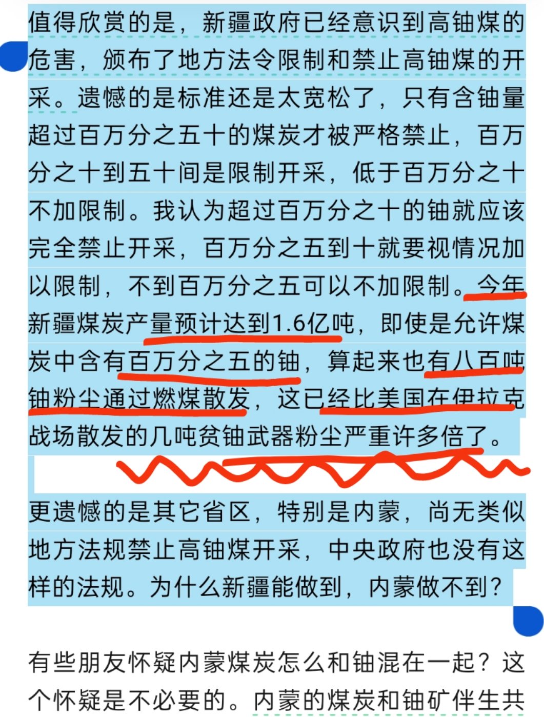 中国很多煤炭是富铀煤,新疆每年燃烧的煤炭放射性物质是美国在伊拉克投放的贫铀弹的数十倍。这个数据后果,等于中国政府每年在新疆释放很多个贫铀弹。超过美国在伊拉克很多倍。也等于中国各地都在给老百姓释放贫铀弹,形成了各个省市区域的雾霾。
