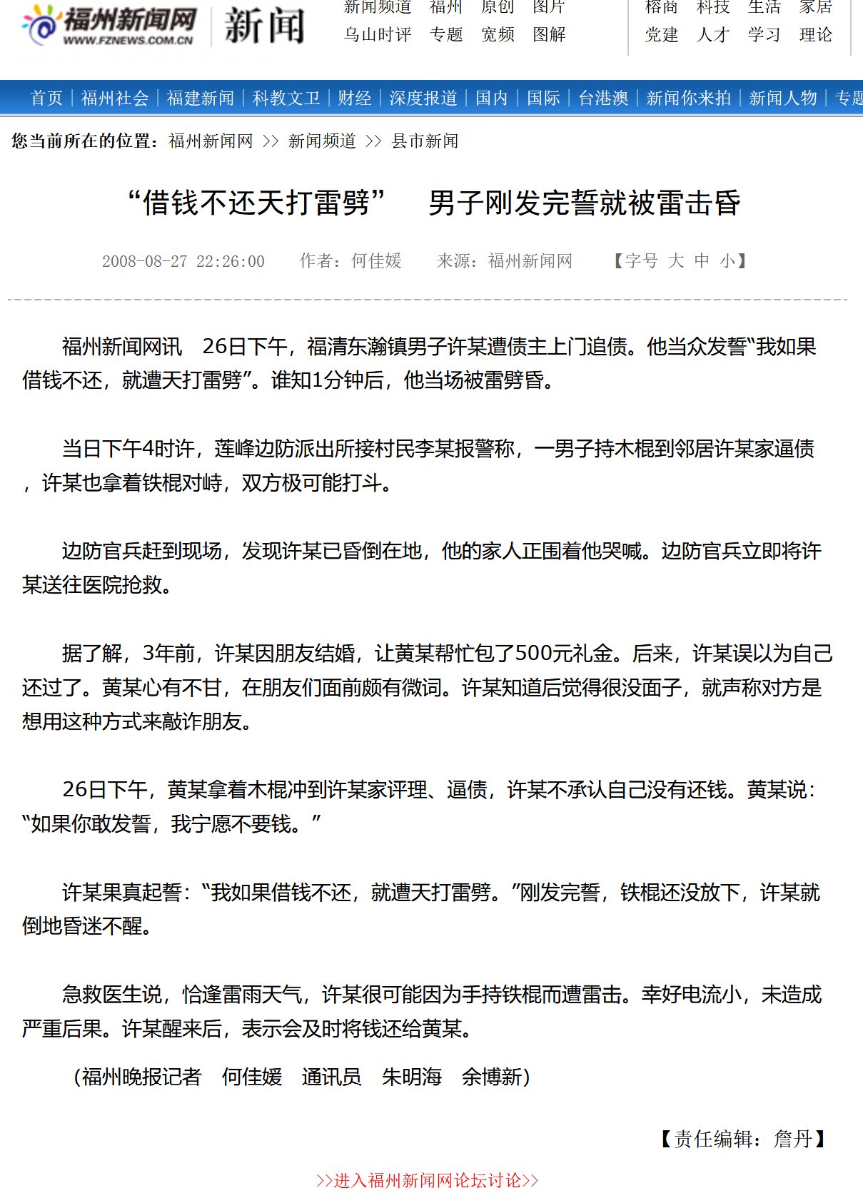 2008年8月26日下午,福清东瀚镇男子许某遭债主上门追债。他当众发誓“我如果借钱不还,就遭天打雷劈”。谁知1分钟后,他当场被雷劈昏。