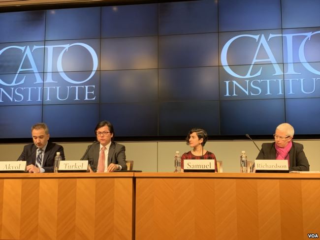 维吾尔人权项目主席努瑞·图尔克(左二) 在华盛顿智库卡托研究所有关新疆的研讨会上发言说:中国政府成功通过国家媒体,将维吾尔人描绘成假想的“国家公敌”。(美国之音萧雨拍摄)